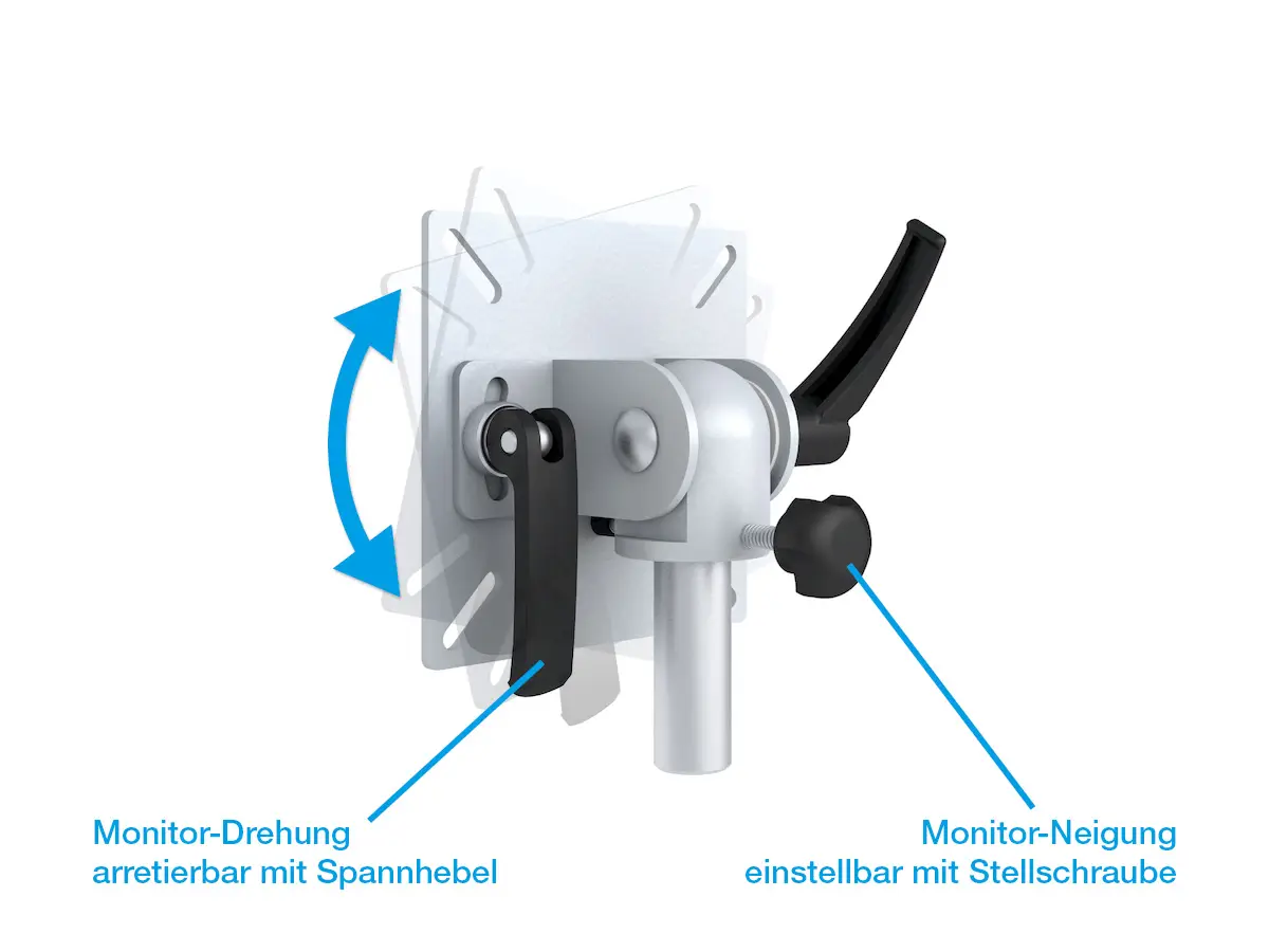 Jeder Vario/Flex-Arm ist an 2 Punkten horizontal drehbar. Die vertikale Einstellung erfolgt stufenlos mittels Stellring. Die Feinjustierung erfolgt durch den VESA-Adapter.