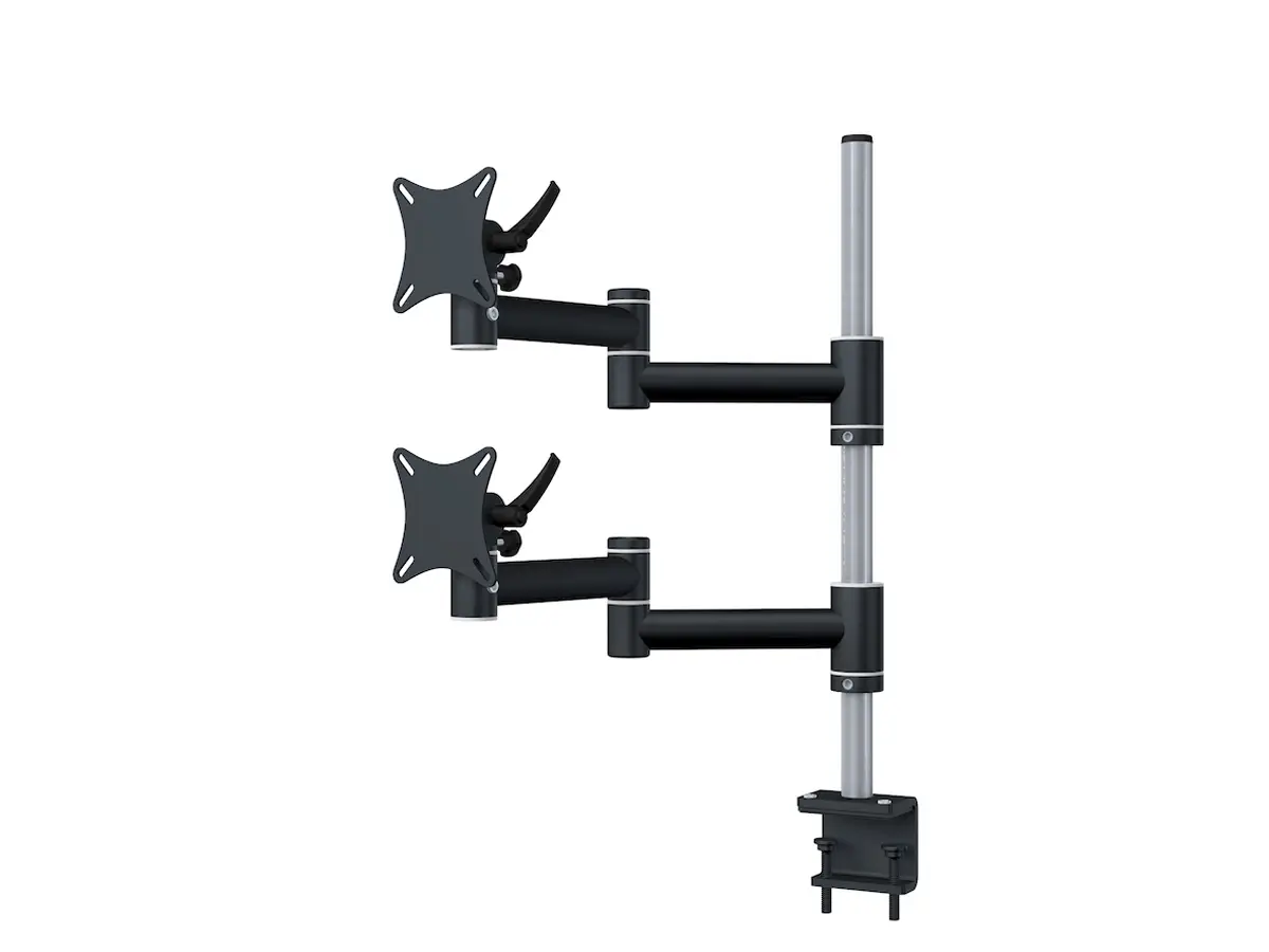 Die 2-fach Monitorhalterung lässt sich stufenlos verstellen. Über die VESA-Halterung können die Bildschirme sowohl horizontal als auch vertikal ausgerichtet und individuell in der Neigung angepasst werden – für eine ergonomische und effiziente Arbeitsumgebung.