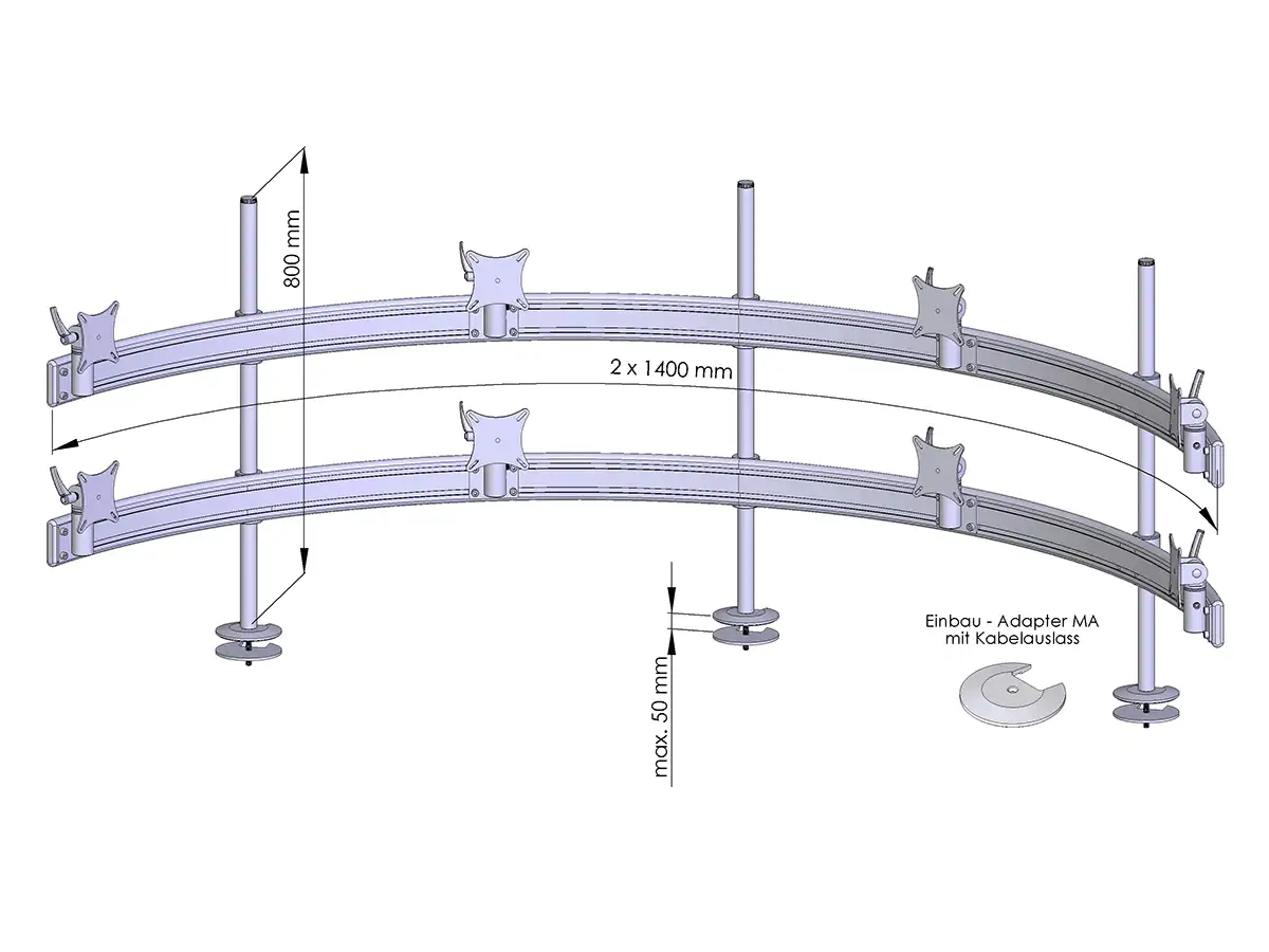 - zur parabolischen (halbrunden) Anordnung von 2 bis 8 TFT-Monitoren